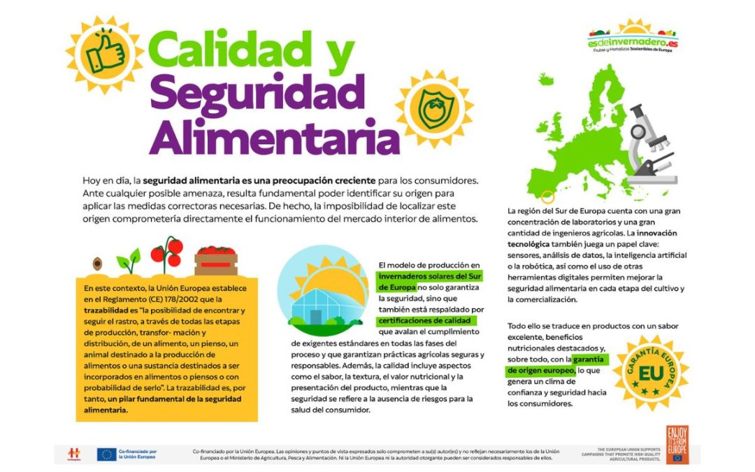 La seguridad alimentaria es una prioridad en los invernaderos solares del Sur de Europa. Gracias a la trazabilidad establecida por la Unión Europea y a la aplicación de certificaciones de calidad, cada fruta y hortaliza puede ser controlada desde su origen hasta su llegada al consumidor.